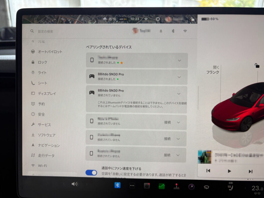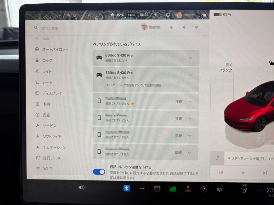 - Tesla車にてBluetooth接続画面でデバイスの検索をすると「8Bitdo SN30 Pro」というデバイスが表示されるので接続する。