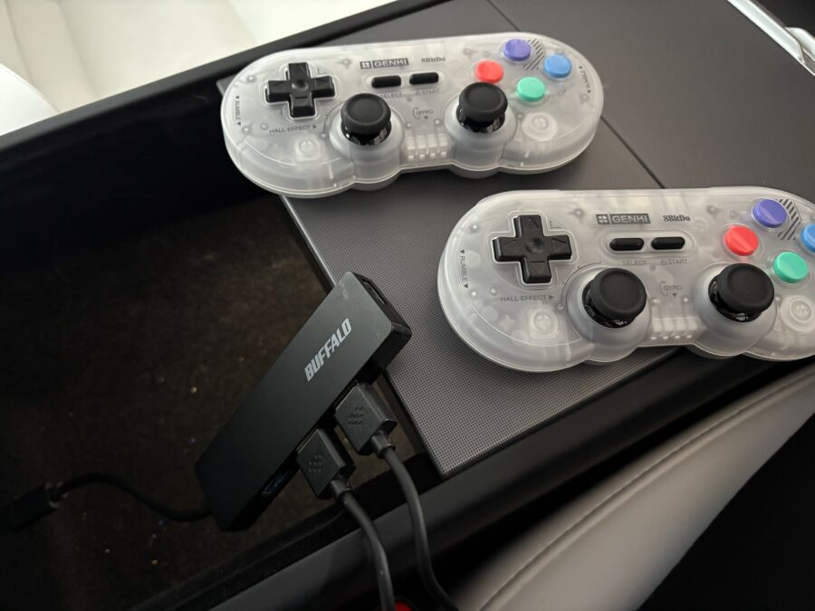 GENKI PocketProはSwitch、Windows、Android、Appleなど幅広いハードウェアコンソールに対応するゲームコントローラー。薄型でコンパクトなのでTesla車内に入れておくのに持ってこいなサイズ。