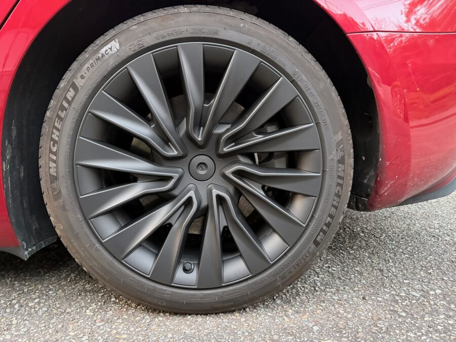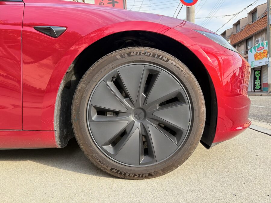 Model 3 Highlandのホイールカバー、デザイン的にはイマイチ。空力(電費)重視のデザインとのことなのだけど、かっこよくしたい。