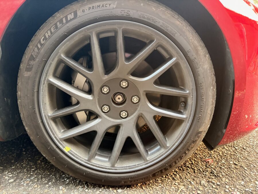かっこいいんだけど、ナットが露出したままなのはイマイチ。一部には「Teslaのセンターキャップが入るのでは」とのことだったのだけれど、どうもHighlandになってサイズが変わったらしく、これまでのModel 3・18インチのセンターキャップは入らないことがわかった。